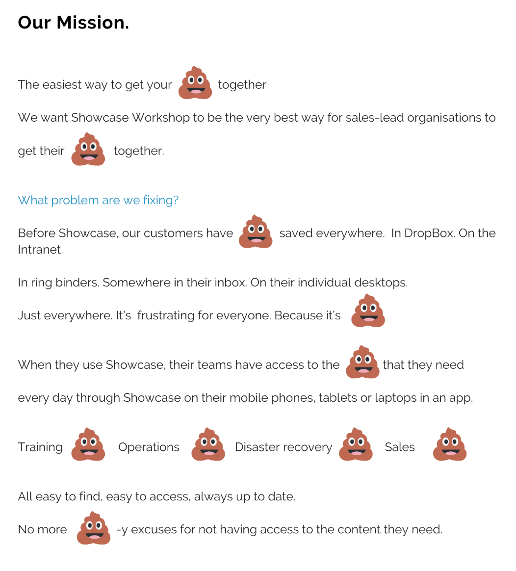 I recently joined Mamie on her podcast to talk about meetings. Among other things, we talked about our liberal use of the “poop” emoji in the Showcase mission statement and how our playful team playbook contributes to and mirrors our company culture.