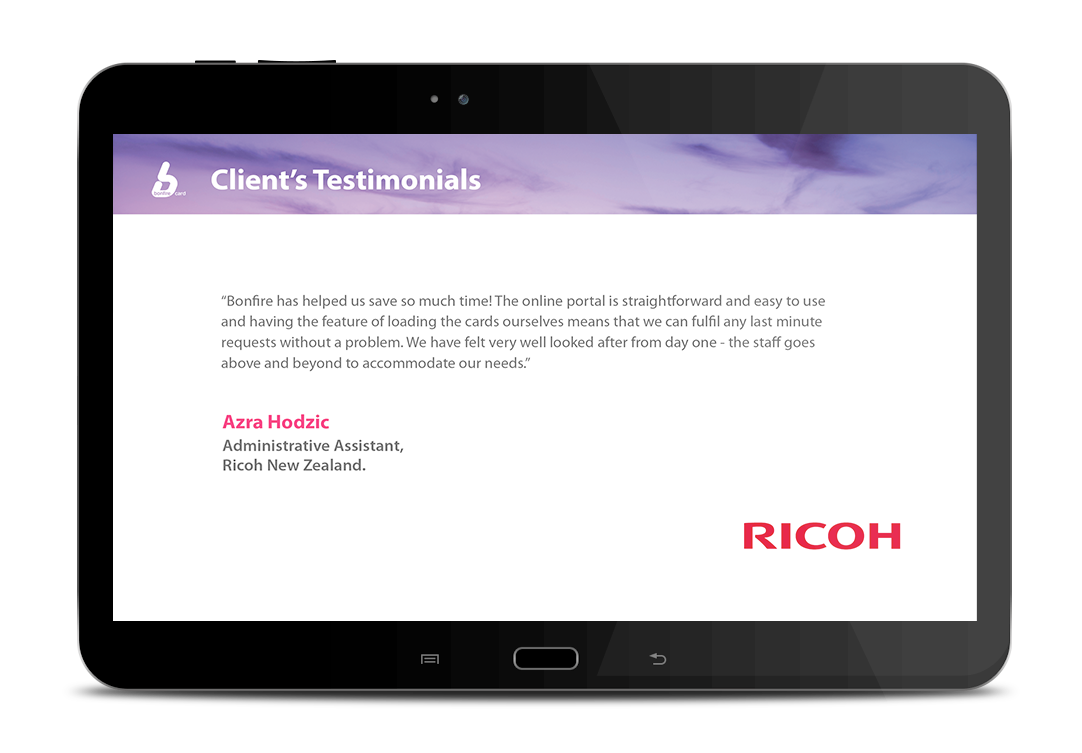 To get a showcase design up and running, Card Works first utilised design superstars and preferred Showcase partner, Stun. Once Stun had whipped up some gorgeous slides, the design files were given to Card Works to maintain and update the Bonfire showcase in the long-term. This whole process - including some training on how to use the Showcase platform - took a mere 6 weeks. Speedy!