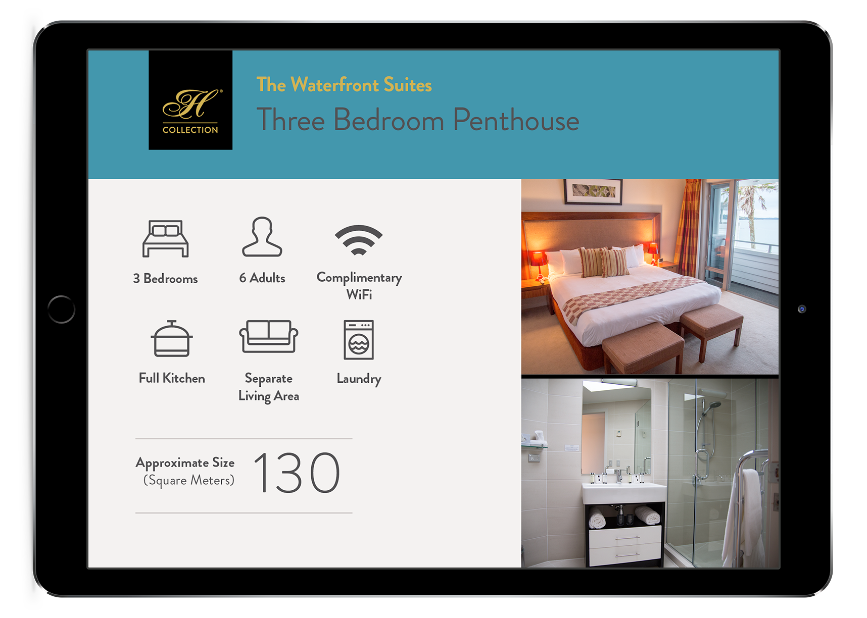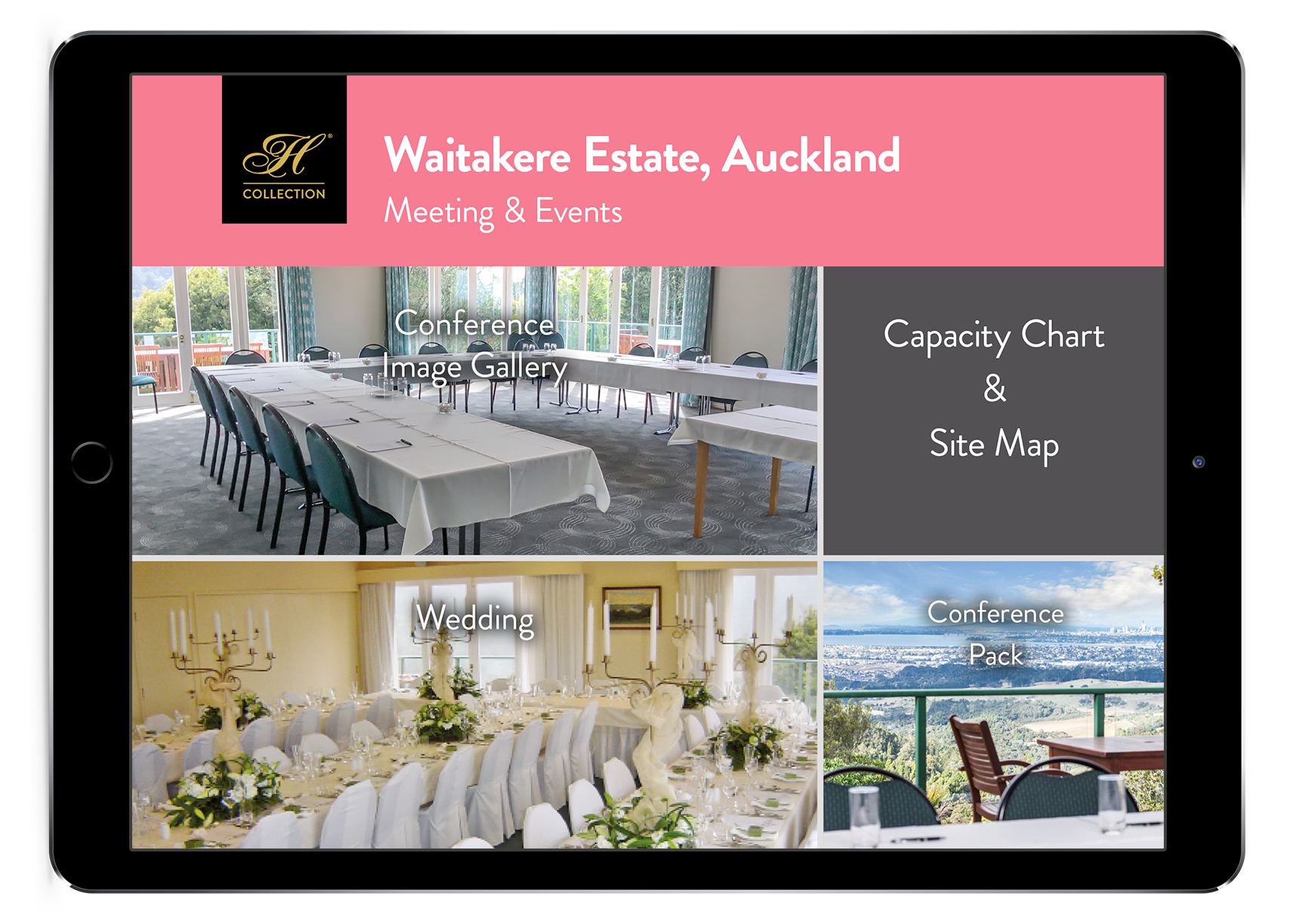 Tapping through to a specific site shows another branching menu, giving the option to talk about the destination in general, the specific rooms available, the event capabilities, or other facilities on-site. Each site also has a gallery of high-res images showing the hotel at its best.