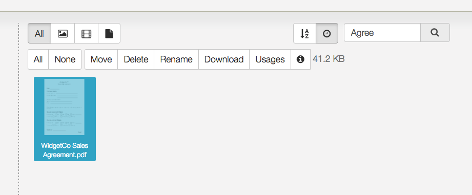 Alrighty, so I've searched, and I've selected my "Sales Agreement" file. Here's the first indication that something is different - there is a new button along the top! It's called "Usages".