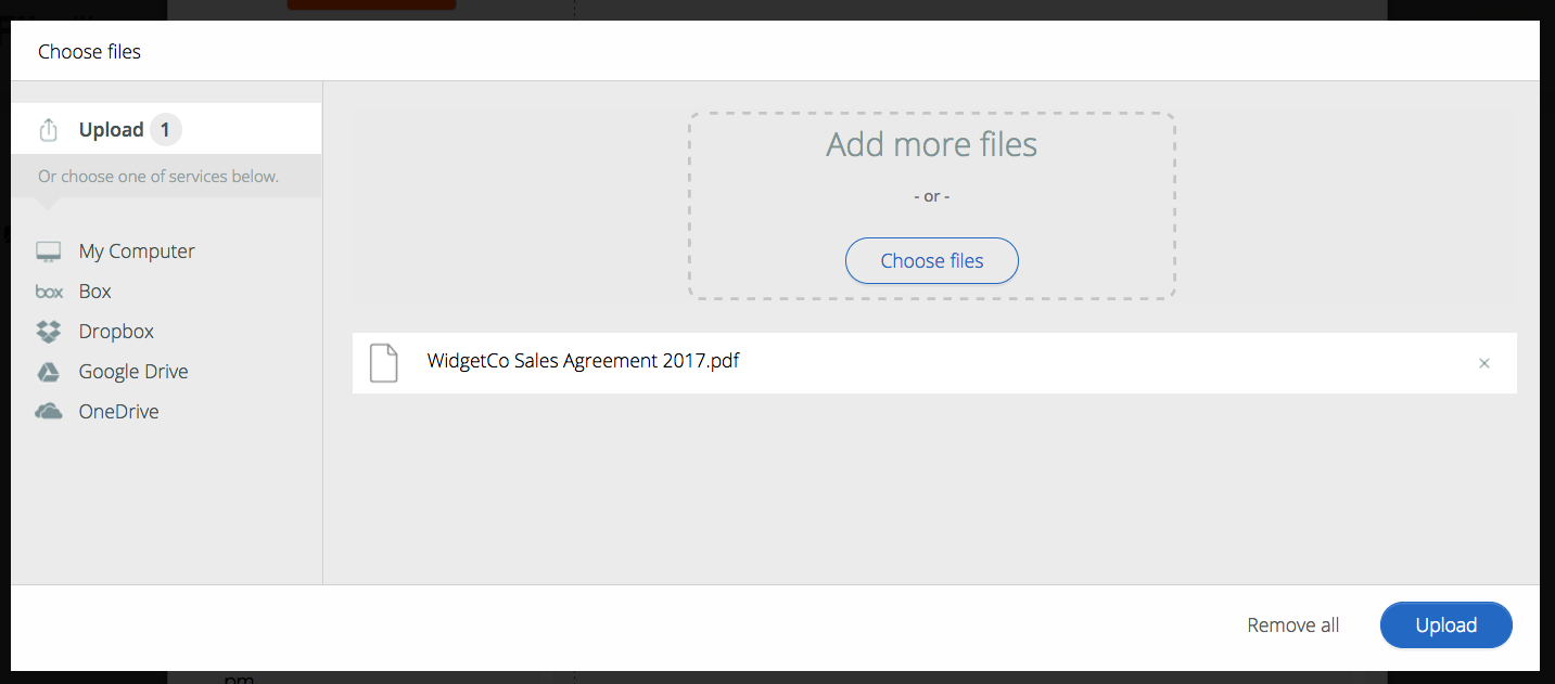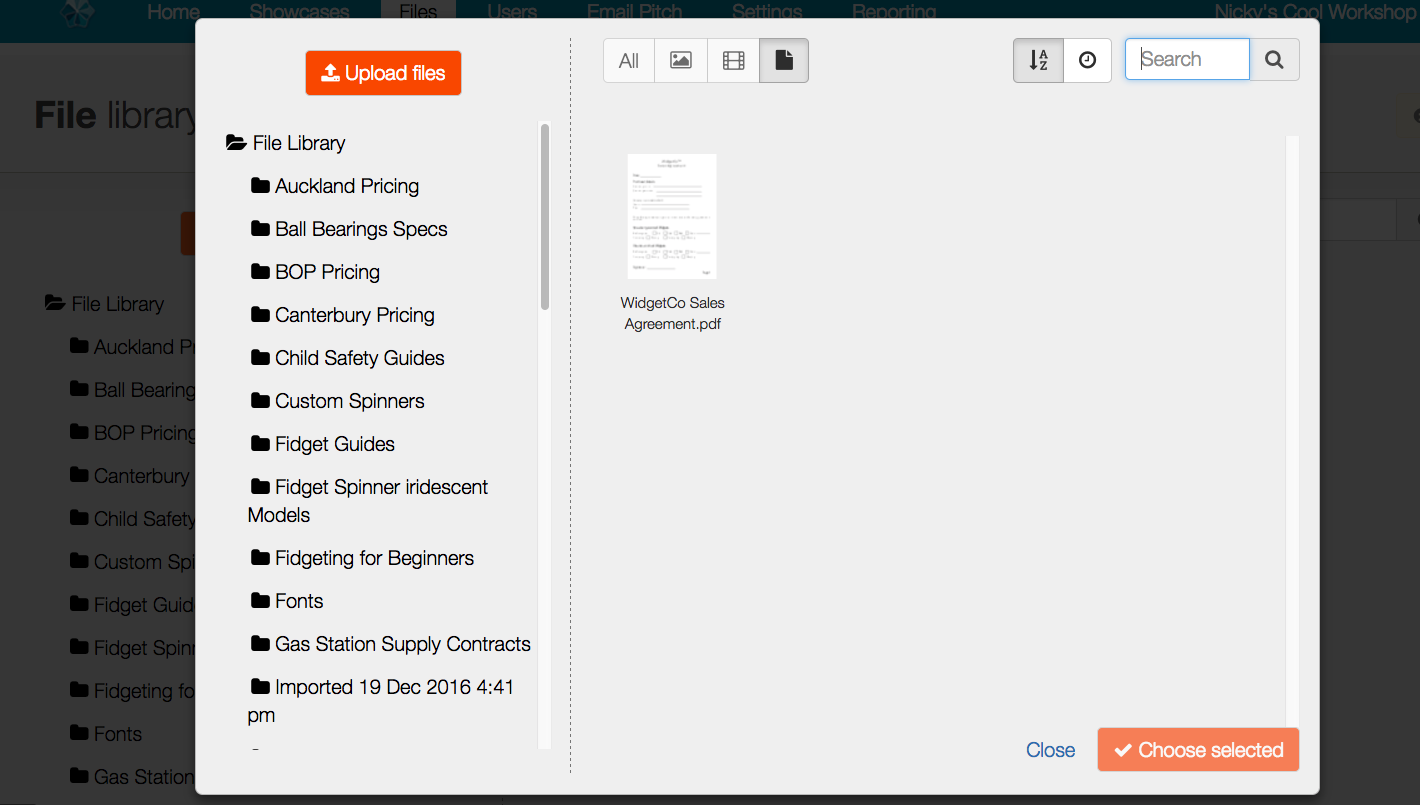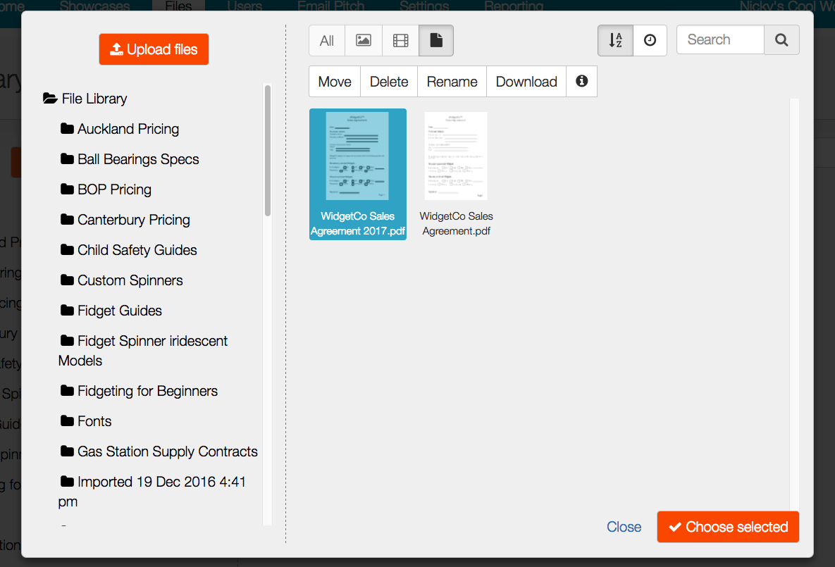 Because we're replacing a file, we need to get the new file we're going to put in place of all those instances of the original "WidgetCo Sales Agreement.pdf". So we can choose that from another visual instance of the file library that has popped up. It's your same file library - just in another smaller window so we can choose this replacement file.