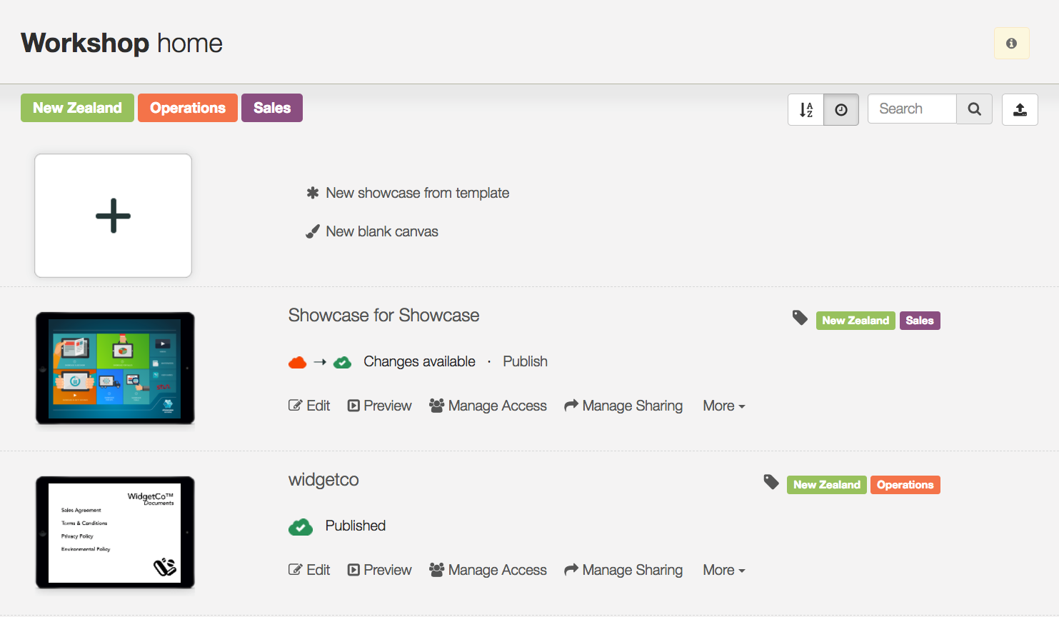 Firstly, if there are labels in place for any showcases, you will see them all along the top of the workshop home screen.