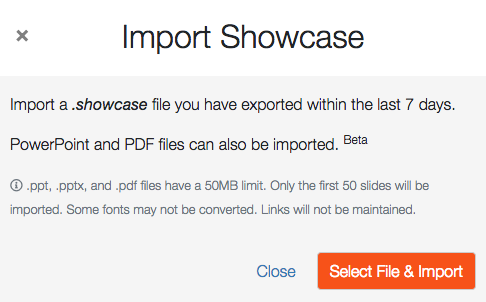 One small thing to note is that the Import function will only import up to 50 slides (50 pages), so if you are importing from a PDF that's pretty big, it pays to check your page amount before importing otherwise you'll end up with a beautiful showcase that ends at slide 50.