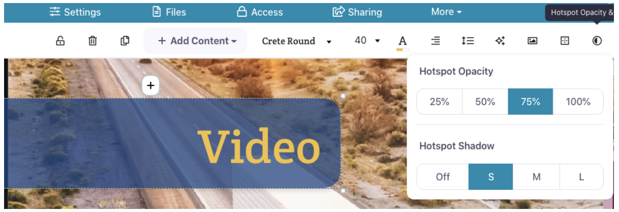 Opacity will reduce the opacity of the hotspot background to the specified amount. Hotspot background is everything except text – in other words, the hotspot image, fill color, and any borders you’ve applied.