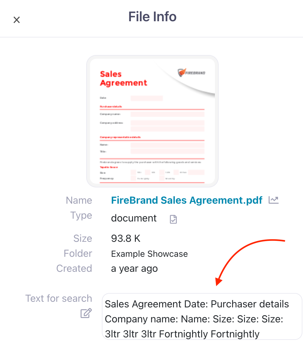 Every time you upload a file to the File Library, Showcase will automatically extract any text from the file and add it to our search index. This text is stored in the File Info dialog for each file.