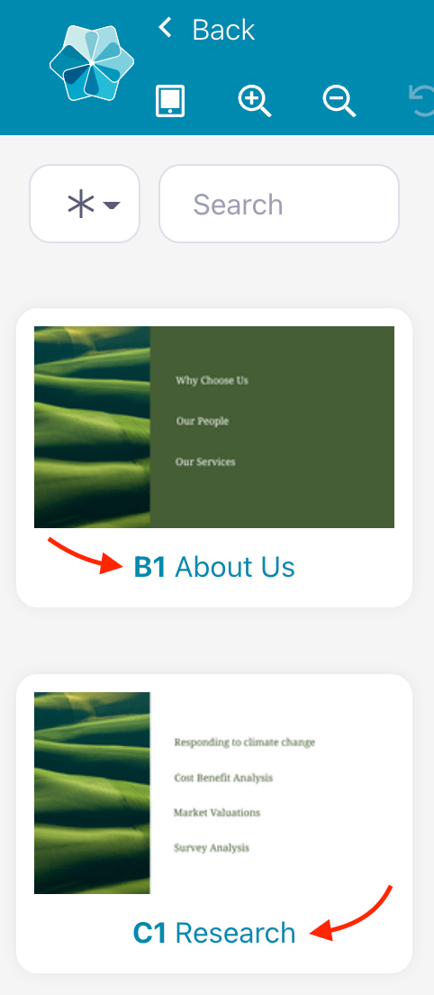 Creating simple, intuitive titles for each slide makes it easy for Viewers to search a presentation in the middle of a sales meeting or pitch.