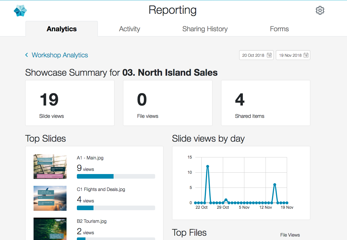 Have a skim through the 'Top Slides' list at left, and 'Top Files' on the right, to check out what your team's actually been viewing the most. If they're always looking at your case studies slide, but there's only a couple files linked there, you could consider adding another example.