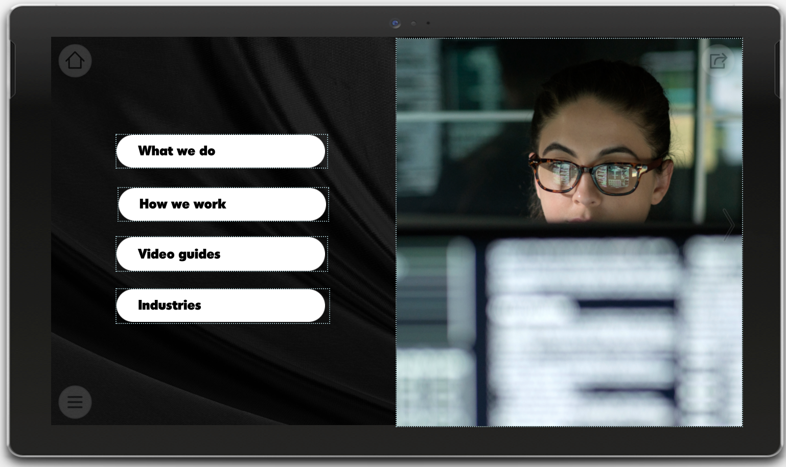 Take a look at the screenshot below. See the lightly dotted lines around the menu items? Those are the hotspots. The lines are only visible from the Editor and will completely disappear when someone views the presentation.
