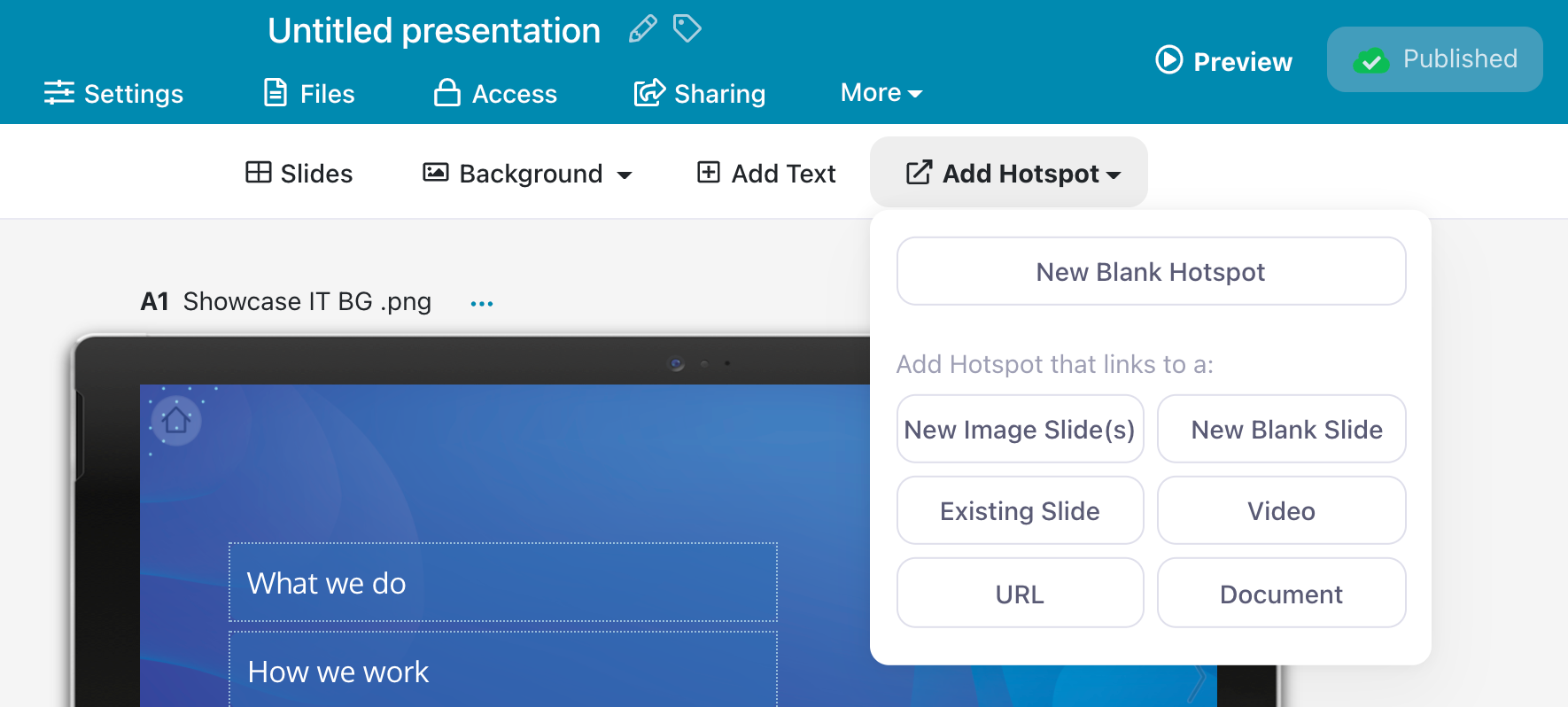 A hotspot is essentially a link. It's a tappable or clickable area that users click to get to another part of your presentation — whether that's a file, a video, or another slide. They also double as text or image boxes if you want to add some content without linking it to anything!