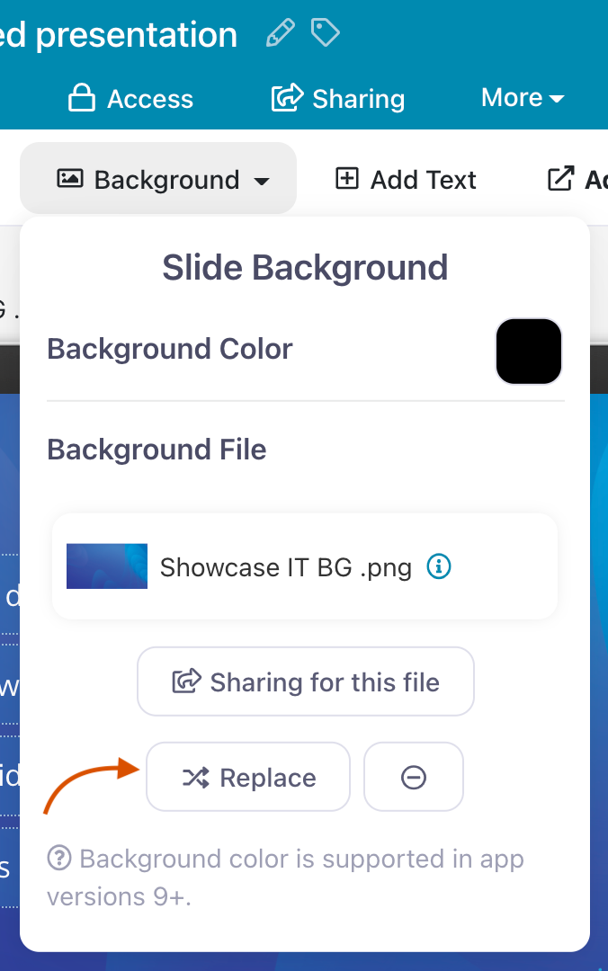 If the slide already has a background image, you'll see details of the file in the drop-down menu. To replace it, click 'Replace' and select a new file. To remove it completely, click the 'minus' icon next to 'Replace'.