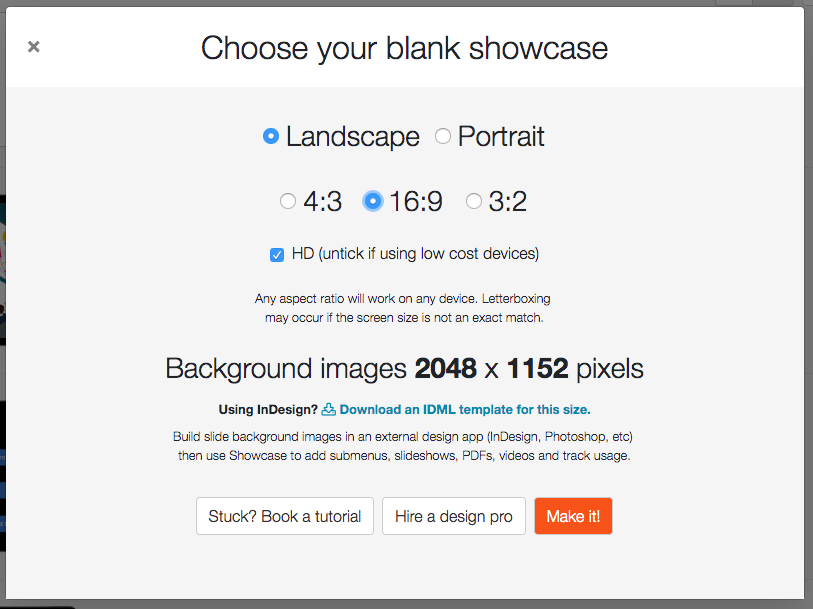 There's a brand new IDML template available in the "new blank showcase" dialog. The new template is 16x9 HD landscape, so if you're in need of this size - select 'New Blank Showcase' and select 16:9. You can see under the 'Background Image' text there is a link to download the IDML template.