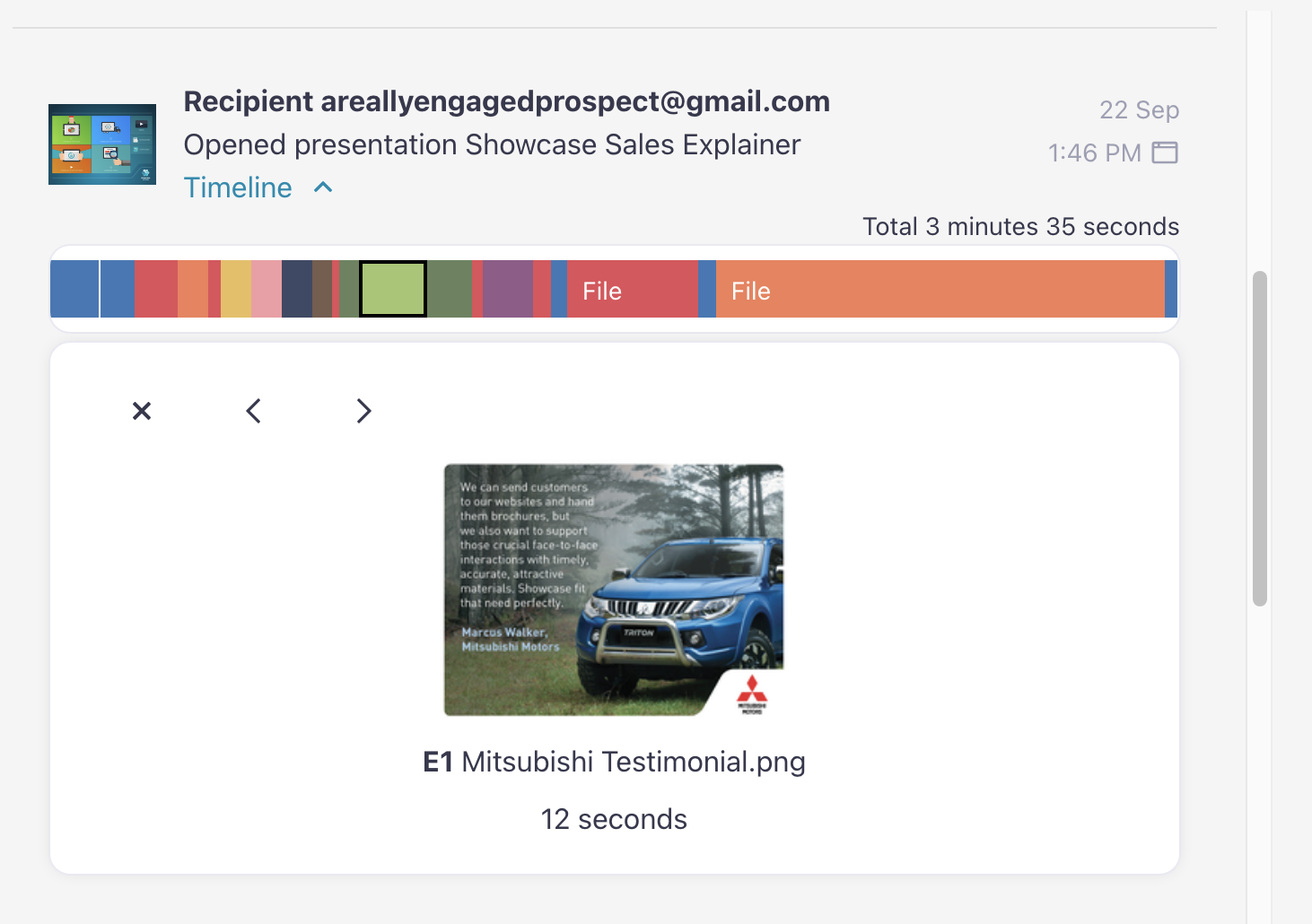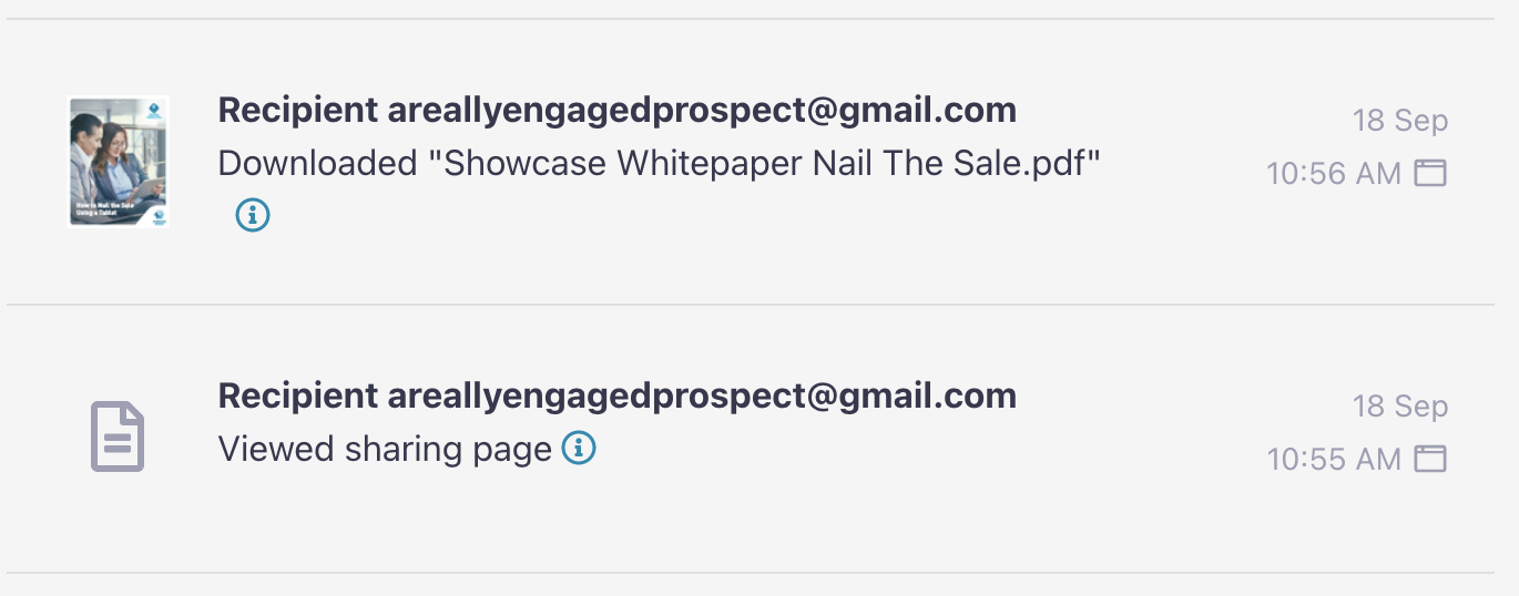 We've long been proud of the rich data that our sharing engine provides you. The biggest part of this is the "timeline"; a blow-by-blow look at which slides and files of the presentation your prospect was looking at, and for how long.