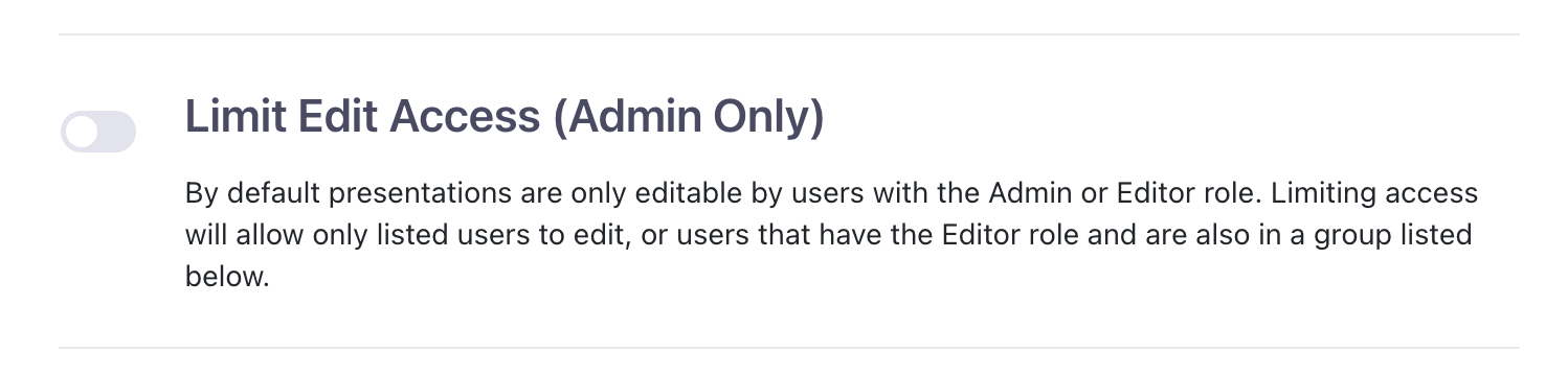 When we launched the ability to limit which editors can edit a presentation, we suggested that it'd be Admins who'd mostly be using the feature. However, we didn't explicitly restrict the functionality to Admin users — which meant that Editors could switch "Limit Edit Access" on, and promptly lock themselves out of that presentation! This was a bit weird, so we've now fixed it such that “Limit Edit Access” is something only Admin users can do.