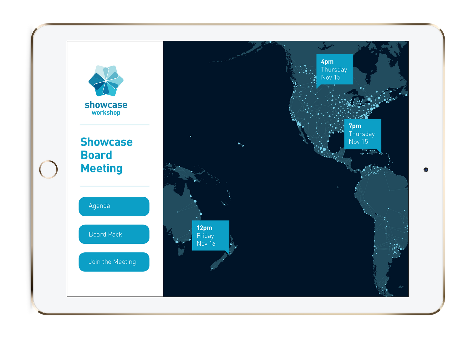 The main menu has a handy map which shows what time and date the meeting will take place in all areas - no getting the calendar invitation confused in this case!