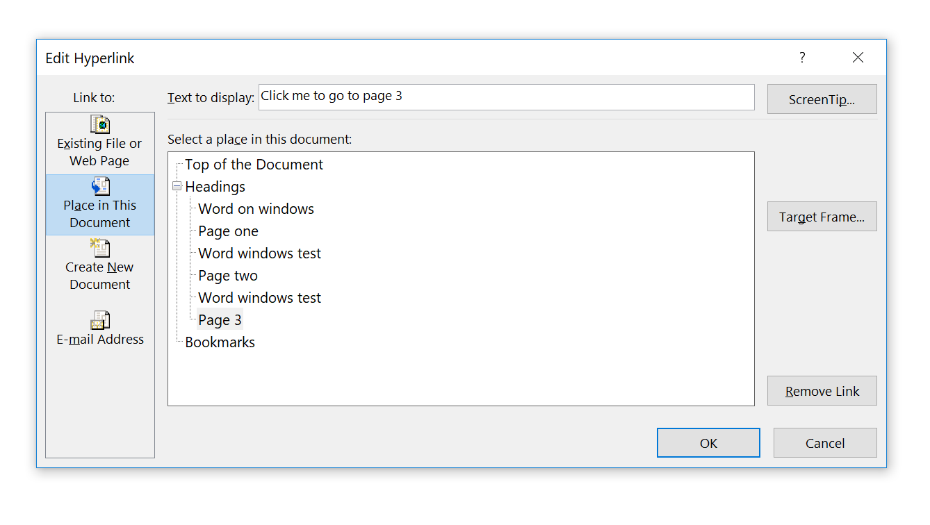If creating an internal link, you first have to have Bookmarks or Headings set up in the document. Then Insert > Hyperlink is the way to go. The panel will give you the option to link to "Place in This Document", and will then list all of the Headings / Bookmarks that you have set up. In this example, I have a heading that says Page 3, so I can link to that specific heading:
