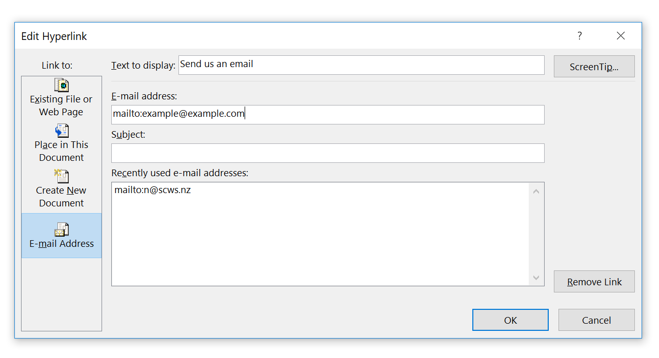When setting up a mailto link, Word does an odd thing where it pre-populates the text box with the "mailto:" part at the front, even if you just type example@example.com.