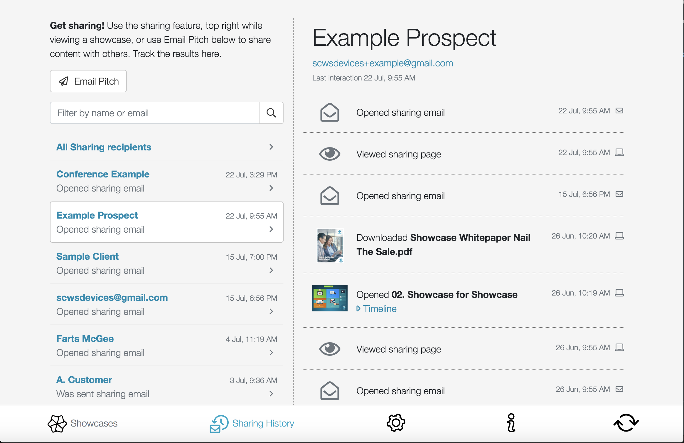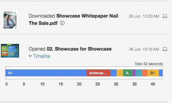 That sharing is backed up by comprehensive tracking: our 'Sharing History'. See whether prospects downloaded your files and looked at your showcase - and if they did, what slides they looked at, for how long.
