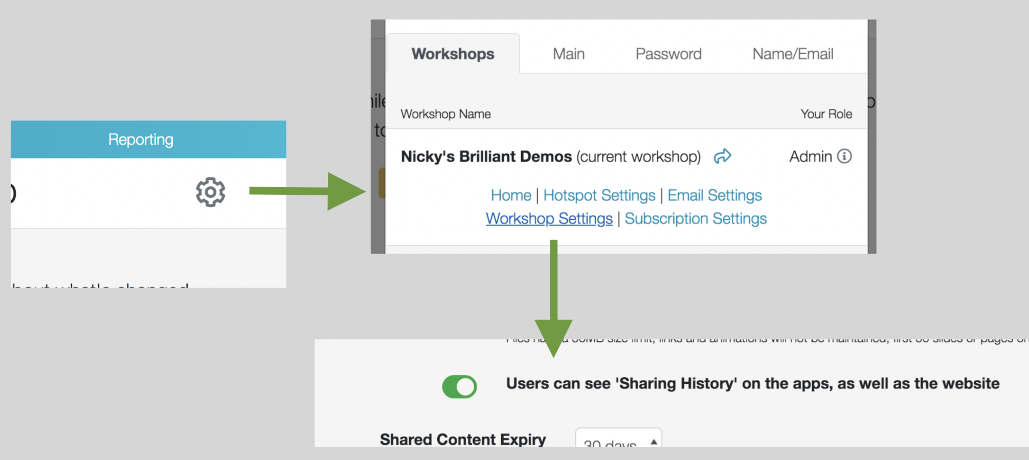 Admins: you can do this by clicking the 'Settings Cog' top right of the website https://app.showcaseworkshop.com, choosing 'Workshop Settings', and scrolling down to the 'Users can see 'Sharing History' on the apps' switch.