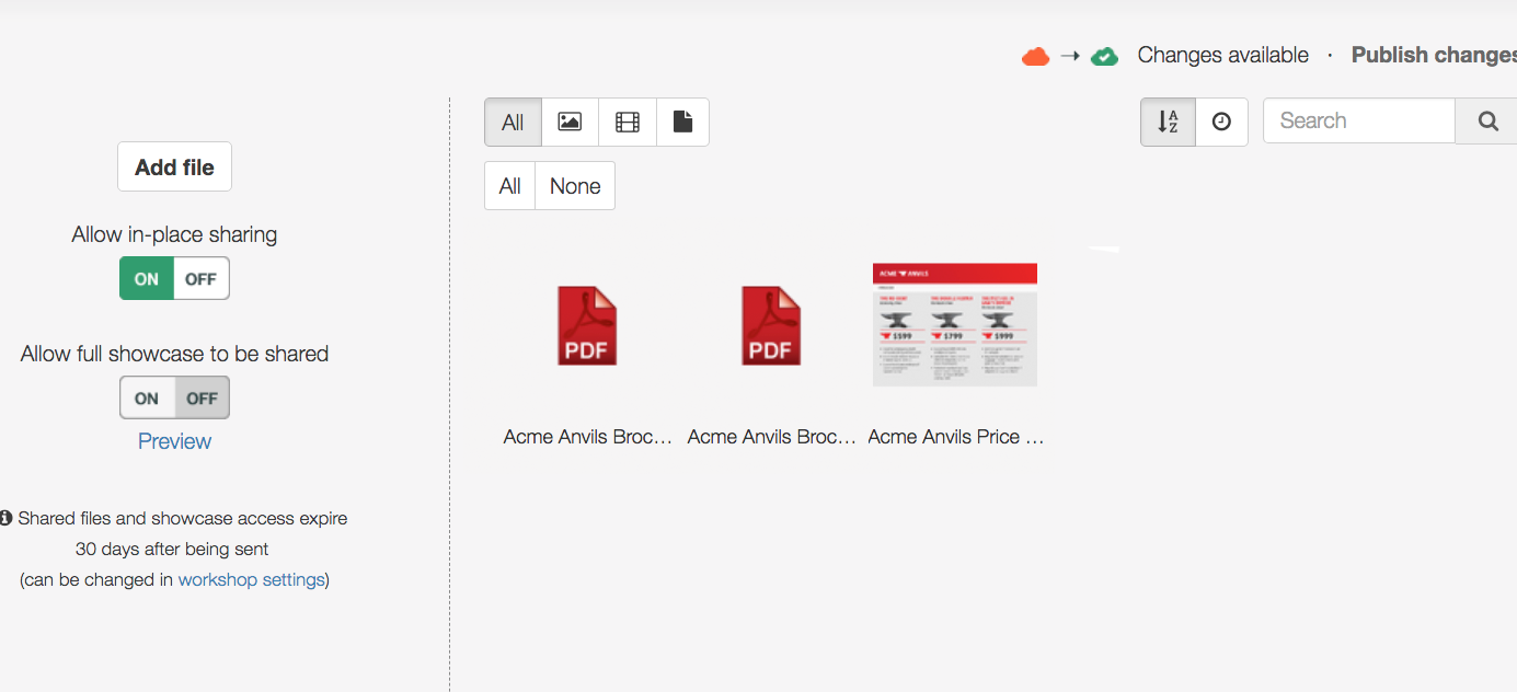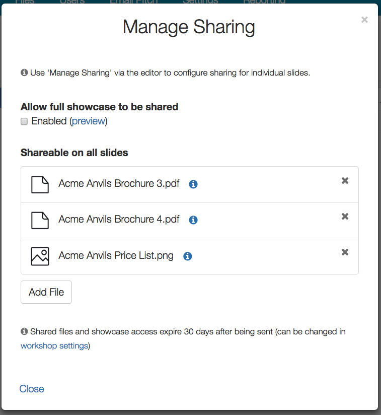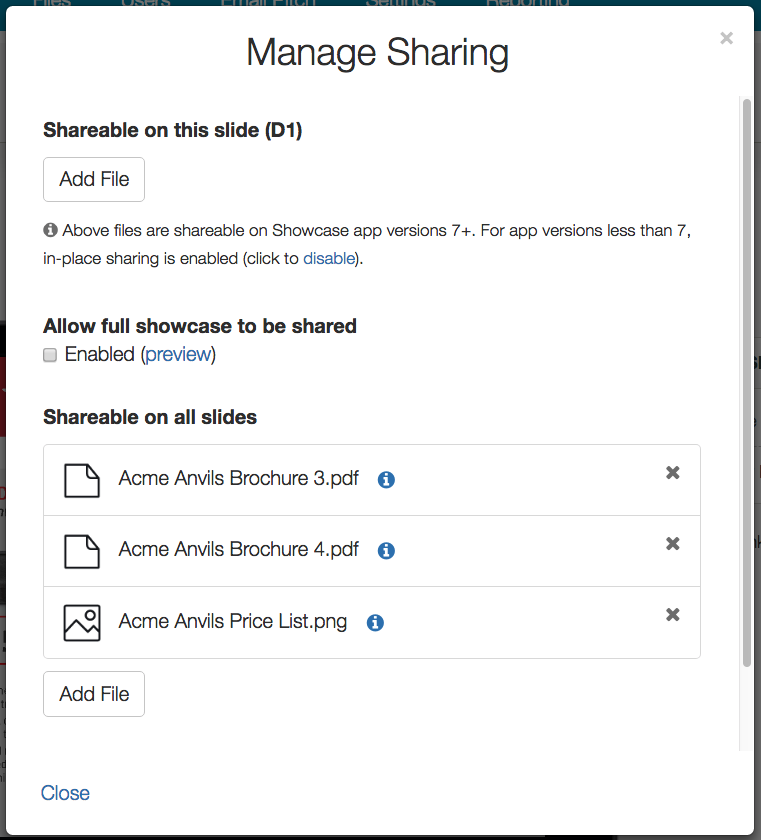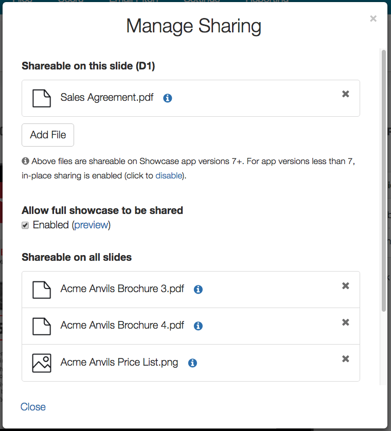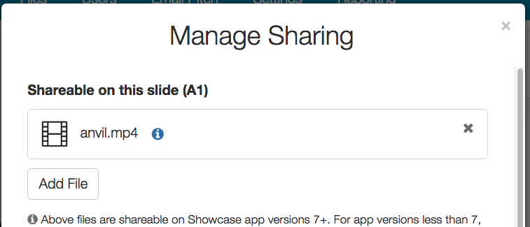 As before, these files are ordered alphabetically and will appear in the Sharing dialog in the app no matter what slide the viewer is on. Just like before, you can remove files from this list (you now do so using the 'x' at the end of the row) and you can also add new files to this list using the "Add file" button.