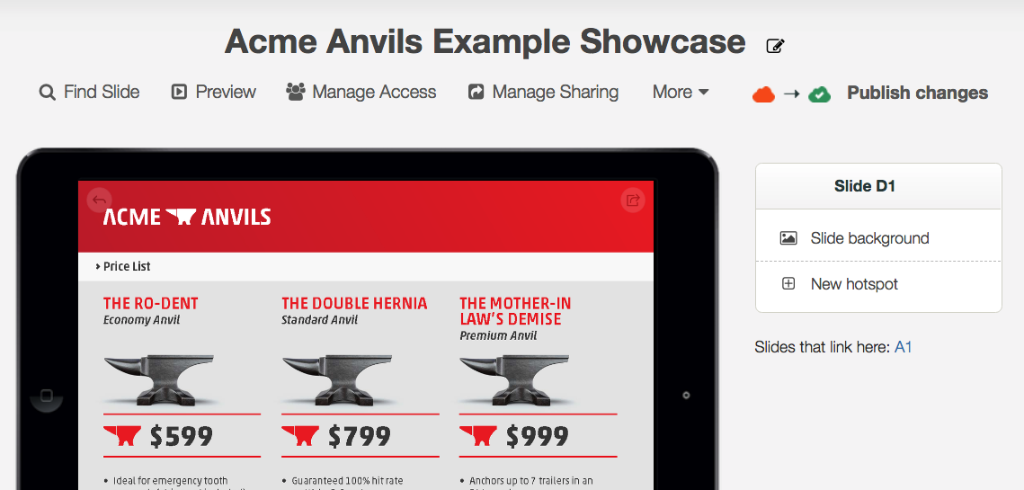 Here I am editing the Acme Anvils Showcase on slide D1.