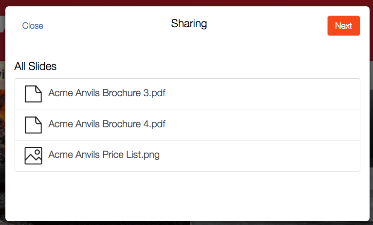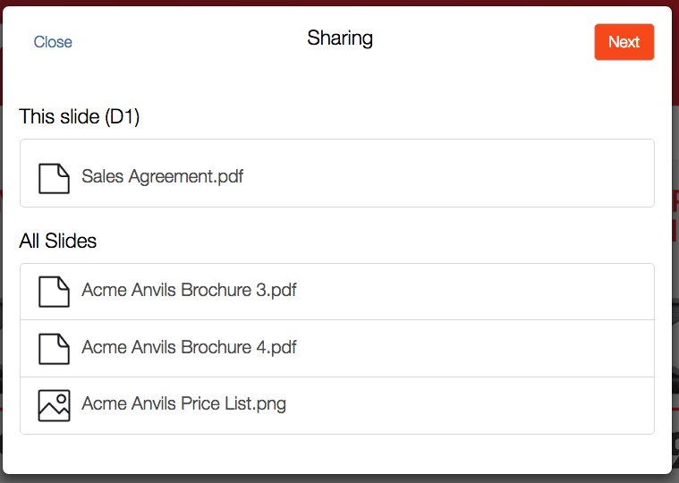 However if viewing the showcase from a slide that doesn't have slide specific sharing, for example, A1, the dialog simply shows the files that are available on all slides: