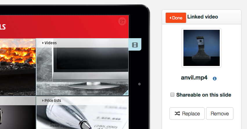 In addition to making files shareable from certain slides on this "Manage Sharing" dialog, it's also possible to make a file shareable at the point that you add it to a hotspot. So for example if I am adding a video to a hotspot, I can choose to make that video shareable from this specific slide as well, by ticking "Shareable on this slide":