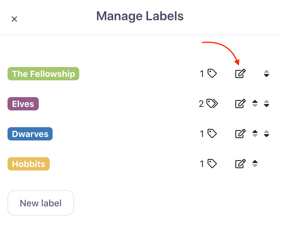 To rename, delete, and change the assigned color of the Label, click the Edit icon (the one that looks like a pencil on paper).