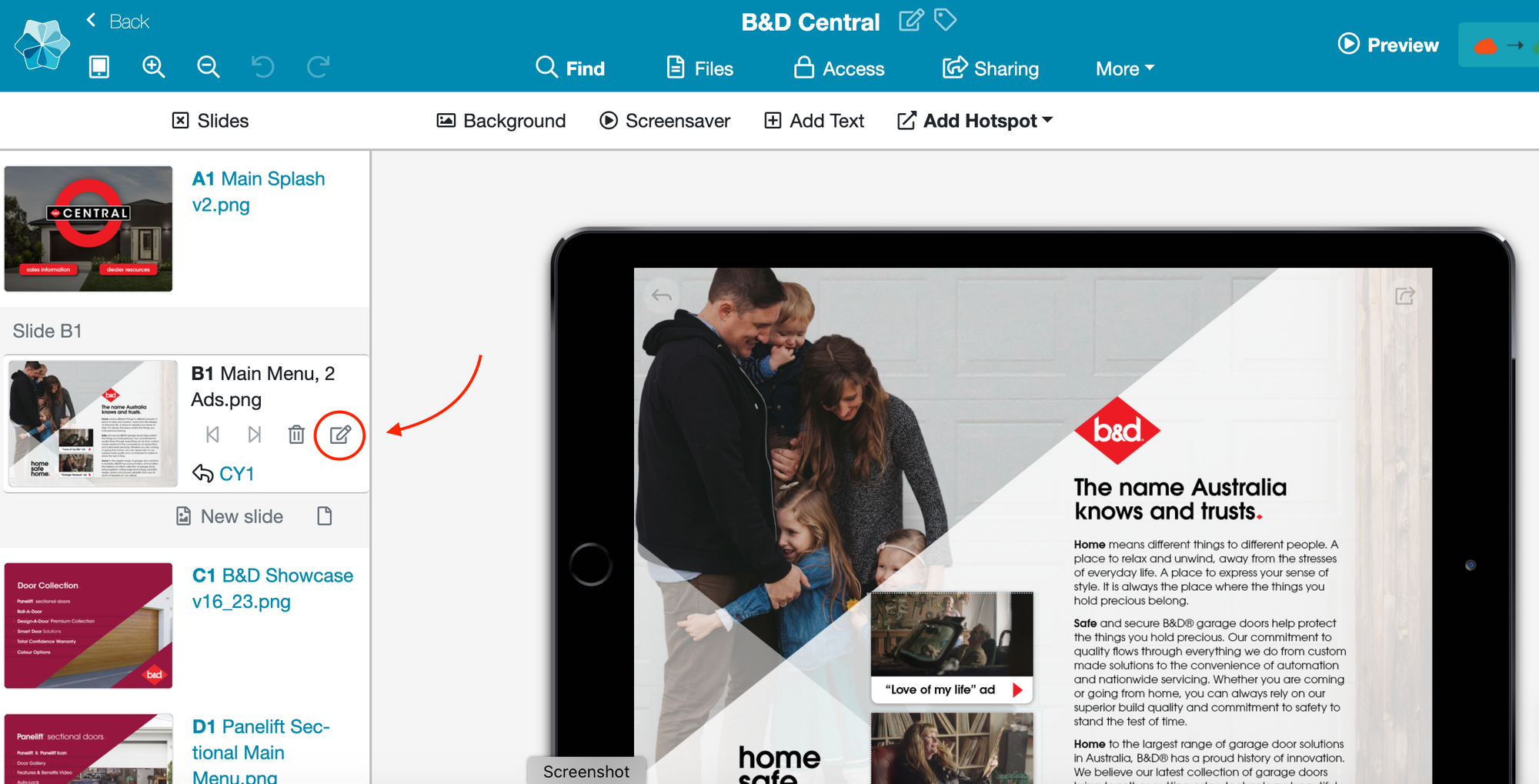 You can find a list of your slides and their names to the left of your showcase in the Editor screen.